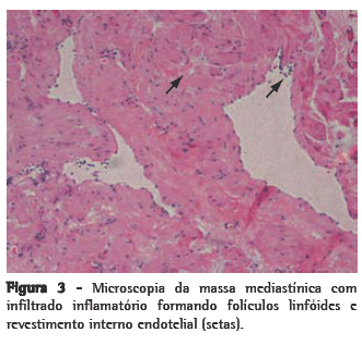O tratamento consistiu em toracotomia lateral direita com exérese da lesão cística paratraqueal direita, com o envio da peça cirúrgica para exame anatomopatológico. O exame macroscópico da peça cirúrgica revelou uma lesão nodular cística de 4,5 cm na maior dimensão, de parede fina, com superfície externa lisa e superfície interna trabeculada e esbranquiçada, apresentando um conteúdo seroso amarelo claro. Microscopicamente apresentava uma parede cística com fibrose e infiltrado inflamatório formando folículos linfóides, com revestimento interno endotelial e com imunorreação para o soro anti-CD34 (Figura 3).