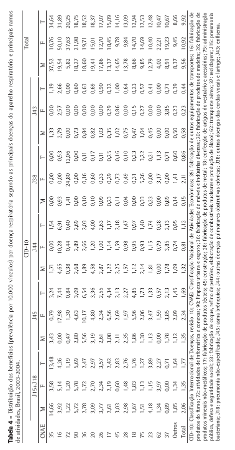 A avaliação dos benefícios por doenças específicas e ramos de atividade econômica mostra que as pneumonias predominaram nos grupos "fabricação de outros equipamentos de transporte" (13,48), "limpeza urbana e esgoto" (5,69) e "fabricação de produtos do fumo" (4,26). A asma incidiu mais nos trabalhadores dos grupos "fabricação de produtos do fumo" (7,44), "fabricação de móveis e indústrias diversas" (6,54), "confecção de artigos de vestuário e acessórios" (4,85) e "fabricação de produtos têxteis" (4,34). A DPOC esteve associada a "fabricação de produtos do fumo" (6,91), "fabricação de produtos de madeira" (4,00), "limpeza urbana e esgoto" (2,69), "fabricação de produtos minerais não-metálicos" (2,63) e "construção" (2,18). As doenças das cordas vocais e laringe estiveram presentes em "atividade de informática e conexas" (12,06), "atividades de intermediação financeira" (4,63), "administração pública, defesa e seguridade social" (3,22) e "educação" (3,18; Tabela 4).