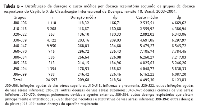 A duração total dos afastamentos, considerando tratar-se de duração mínima, foi de 5.157.537 dias perdidos, a um custo total de R$ 110.570.836,97. A média da duração mínima dos benefícios foi de 209,68 ± 218,54 dias, gerando um custo médio de R$ 4.495,30 ± 6.123,03 por benefício. As DRs por agentes exógenos, embora com uma baixa prevalência (0,30), foram as que demandaram maior tempo de afastamento (296,72 ± 235,43 dias) e maior custo (R$ 7.105,74 ± 7.784,45), seguida do grupo das doenças intersticiais e do grupo das doenças obstrutivas crônicas (Tabela 5).
