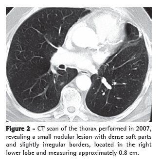 In clinical practice, physicians often regard new lesions in patients with a history of cancer as tumor recurrence. Consequently, the physicians do not offer curative options to such patients, referring them instead for palliative treatment. In a study involving patients with a history of extrapulmonary cancer in which a pulmonary nodule was incidentally found or found during a follow-up examination, surgical intervention confirmed the presence of metastases in only 41.3% of the cases.(2) In 33%, the histological findings were consistent with primary lung cancer. In that study, most of the nodules were treated by video-assisted thoracoscopy. In the case presented here, the location of the nodule, and its size in particular (smaller than 1 cm), were not appropriate for this procedure.