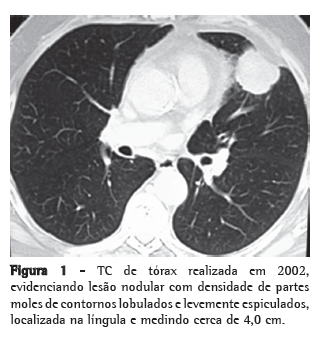 operado gera a suspeita de recidiva tumoral e indica a necessidade de re-estadiamento. Apresentamos o caso de um paciente de 71 anos submetido à lobectomia pulmonar com ressecção de pericárdio e linfadenectomia mediastinal (T3N0M0). Cinco anos após a cirurgia, detectou-se a presença de uma nova lesão pulmonar. No re-estadiamento, foi diagnosticada uma lesão sincrônica no fígado. Apesar da forte suspeita de recidiva tumoral, prosseguiu-se a investigação e uma punção hepática revelou carcinoma hepatocelular. Para esclarecer a etiologia da lesão pulmonar (hipóteses de recidiva de carcinoma brônquico ou de metástase de carcinoma hepatocelular), foi realizada uma biópsia a céu aberto, compatível com reação inflamatória crônica com focos de antracose e de calcificação distrófica. O paciente foi então submetido à ressecção hepática não-regrada com intuito curativo. Teve boa evolução, com alta no 10º dia de pós-operatório. O presente relato destaca a importância do diagnóstico histopatológico em pacientes com antecedente de carcinoma broncogênico e suspeita de recidiva. Hipóteses diagnósticas