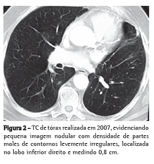 DiscussãoMuitas vezes na prática clínica existe o impulso de se assumir novas lesões, em pacientes com antecedente de neoplasia, como sendo recidiva tumoral, negando-lhe opções curativas e encaminhando-o para terapia com intuito paliativo. No caso de pacientes com neoplasia extrapulmonar prévia e achado de nódulo pulmonar incidental ou em exame de seguimento, a intervenção cirúrgica confirmou a presença de metástases em apenas 41,3% dos casos.(2) Em 33% dos casos, a histologia foi compatível com neoplasia primária de pulmão. A maioria dos nódulos foi abordada por videotoracoscopia. Em nosso caso, a localização do nódulo e, principalmente, seu tamanho (menor do que 1 cm) não se mostravam favoráveis para essa via.