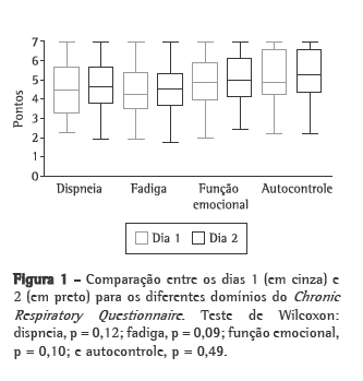 Com relação ao tempo de aplicação do questionário, houve diferença estatisticamente significante entre o dia 1 e o dia 2, sendo que o último teve um tempo de aplicação menor. Acreditamos que essa diferença não tenha ocorrido somente por uma melhor compreensão dos enunciados, mas possivelmente também pelo fato do número de atividades relatadas pelo paciente no domínio dispneia ter sido diferente nos dois dias de aplicação. No primeiro dia de aplicação, a maioria dos pacientes citou mais atividades que provocaram dispneia do que no segundo dia de aplicação. Como os pacientes tinham mais atividades e, dentre as quais, deveriam escolher apenas as cinco mais importantes, isso requereu um tempo maior. Apesar dessa diferença, o tempo de aplicação do CRQ ficou entre 12 e 26 min, o que condiz com estudos prévios.(11,13,14)