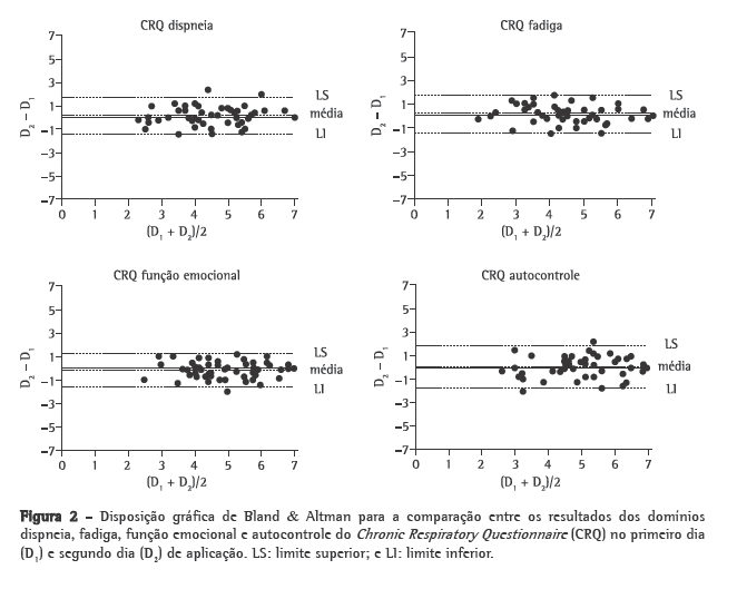 Na comparação entre a aplicação e a reaplicação do CRQ (dias 1 e 2), não houve diferenças significantes em nenhum dos domínios do questionário, como pode ser observado na Figura 1. O CCI dos quatro domínios entre os dias 1 e 2 foi: dispneia, 0,98; fadiga, 0,97; função emocional, 0,98; e autocontrole, 0,95. Pela disposição gráfica de Bland & Altman (Figura 2), pode-se observar uma boa concordância entre a aplicação e a reaplicação do CRQ. O coeficiente alfa de Cronbach total foi de 0,91, e, para os domínios dispneia, fadiga, função emocional e autocontrole, esse coeficiente foi de 0,86; 0,78; 0,81; e 0,70, respectivamente.