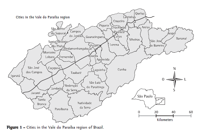 The area of study currently corresponds to the regions Serrana e Circuito da Fé, Alto Vale do Paraíba and Vale Histórico, which constitute, along with the North Shore (not analyzed in this study), the area served by the RHD of Taubaté. The human development index of the cities that constitute this region situates the cities at the two extremes: rich cities, with good social indicators, and poor cities, with precarious social indicators. Although the region has natural identifying landmarks, such as the Paraíba River and the mountain ranges (the Serra da Mantiqueira and the Serra do Mar), it is the Presidente Dutra Highway which marks the distinct social and economic characterization of its cities: the largest and most dynamic centers are located along the highway. This differentiation is also reflected in health care, and the most dynamic cities (especially Taubaté, where the RHD is headquartered, and São José dos Campos) are also where the hospitals and specialized clinics of the region are concentrated. Pediatric hospitalizations were concentrated in three circuits, which are delineated by the cities of São José dos Campos, Campos do Jordão, Guaratinguetá, Pindamonhangaba, Taubaté and Cruzeiro.
