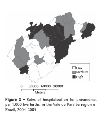 This was the first study using georeferencing techniques to analyze hospitalizations for pneumonia in infants under one year of age in the state of São Paulo, Brazil. The importance of studying the distribution of hospitalizations for pneumonia lies in the fact that this disease is traditionally related to infant mortality(9) and that it is subject to social and environmental factors, as well as to the structure of the public health care system, especially the primary care system.
