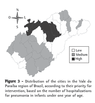 The present study was aimed at using georeferencing techniques in order to identify spatial patterns in hospitalizations for pneumonia in infants under one year of age, as well as to determine which cities should be considered priorities for intervention, in the Vale do Paraíba region of Brazil.
