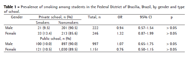 In other studies conducted in Brazil, it is observed that the prevalence of smoking among students can be similar or different from those found in this study. In a study with high school students of public and private schools in Belém, in the state of Pará, the prevalence of smoking was 11%.(16) In Gravataí, in the state of Rio Grande do Sul, researchers found a prevalence of 16.9% and 2.4% for the use of tobacco and other drugs, respectively, in 8th grade students in public schools.(17) However, in Santa Maria, in the state of Rio Grande do Sul, the smoking prevalence in high school students in state schools was 18,5%.(18)