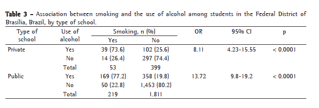 In contrast, when stratified by type of school, 73.6% of the private school students who smoked were found to also consume alcohol, compared with 77.2% of those in public schools, that is, the chance that students who smoked would also consume alcoholic beverages was, in private schools and public schools, respectively, approximately 8 times greater and 14 times greater than was that for those who did not smoke (Table 3).