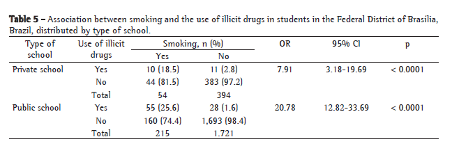 When stratifying the students by private and public schools (Table 5), we observed that private school students who smoked presented an 8 times greater chance of also using illicit drugs than did nonsmoking students; in the public schools, this chance was 21 times greater.
