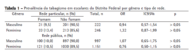 Quanto à prevalência do tabagismo nos escolares do DF, esta foi de 10,5%, sendo 9,9% no gênero masculino e 11,0% no feminino (p > 0,05). Ao separarmos por tipo de rede, 11,5% dos escolares da rede particular e 10,3% da rede pública fumavam (p > 0,05). Porém, ao estratificarmos por gênero e tipo de rede (Tabela 1), encontramos uma prevalência de tabagismo para o gênero masculino de 9,5% na rede particular e de 10,5% na rede pública; para o gênero feminino, essa foi de 13,4% na rede particular e de 10,5% na rede pública. Embora o gênero feminino tivesse uma tendência a fumar mais, sobretudo na rede particular (OR = 1,32; IC95%: 0,87-1,99), não se observou uma diferença estatisticamente significante entre eles (p > 0,05).