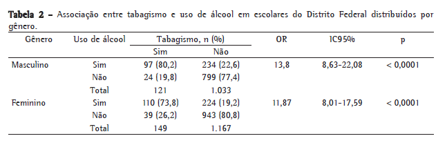 Por outro lado, ao estratificarmos por gênero, 80,2% dos alunos do gênero masculino e 73,8% do gênero feminino que fumavam também ingeriam bebidas alcoólicas. A chance dos escolares que fumavam de ingerir álcool foi aproximadamente 14 vezes maior no gênero masculino e 12 vezes maior no gênero feminino, se comparados, respectivamente quanto ao gênero, à chance dos que não fumavam (Tabela 2).