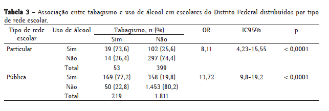 Em contrapartida, ao separarmos por rede, 73,6% dos escolares da rede particular que fumavam também ingeriam álcool; na rede pública, esse número foi 77,2%, ou seja, a chance dos alunos da rede particular de fumar e ingerir bebidas alcoólicas foi aproximadamente 8 vezes maior quando comparada à dos alunos que não fumavam; na rede pública, essa chance foi 14 vezes maior (Tabela 3).
