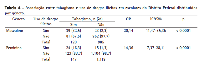 Em outras palavras, a chance dos escolares que fumavam de também usar drogas ilícitas foi aproximadamente 17 vezes maior (OR = 16,96; IC95%: 11,12-25,87) àquela dos que não fumavam. Ao separarmos por gênero (Tabela 4), a chance dos alunos dos gêneros masculino e feminino que fumavam de usar drogas ilícitas foi, respectivamente, cerca de 20 vezes e 14 vezes maior àquela dos alunos que não fumavam.