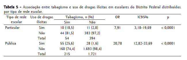 Quando estratificamos os alunos por rede particular e pública (Tabela 5), observamos que os escolares da rede particular que fumavam apresentavam uma chance aproximadamente 8 vezes maior de também usar drogas ilícitas em relação aos que não fumavam; na rede pública, essa chance foi aproximadamente 21 vezes maior.