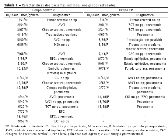 O uso de VM baseou-se em duas ou mais indicações em 15 (79%) e 12 (75%) dos pacientes dos grupos controle e FR, respectivamente, e foi encontrada doença pulmonar associada a outro evento (ou doença) em 10 (53%) e 11 (69%) dos pacientes (Tabela 1).