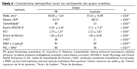 Não houve diferenças significativas entre os grupos no que tange a idade, gênero, escore de Murray, escore APACHE II e ICC. A respeito de parâmetros de VM, não houve diferenças significativas entre os grupos FR e controle no que tange à necessidade de ventilação mandatória intermitente sincronizada (21% vs. 50%) ou PEEP  5 cmH2O (89% vs. 94%). Entretanto, o uso de FiO2 < 50% foi mais comum no grupo FR do que no grupo controle (88% vs. 58%; Tabela 2).