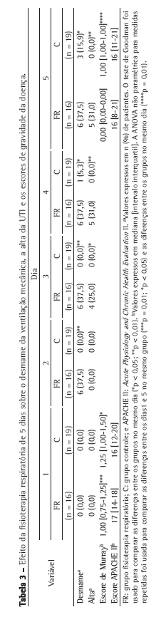 No grupo FR, a melhora da lesão pulmonar, medida pelo escore de Murray, não foi acompanhada de uma melhora da gravidade da doença, medida pelo escore APACHE II. Embora estudos prévios tenham empregado o escore de Murray(28) e o escore APACHE II,(2,3,29) o efeito de intervenções de FR sobre esses índices não foi avaliado, o que impossibilita comparações adicionais. O presente estudo mostrou que embora o escore de Murray tenha melhorado em ambos os grupos, a proporção de pacientes que foram desmamados com sucesso e receberam alta da UTI no dia 5 foi maior no grupo FR do que no grupo controle (37,5% vs. 15,9% e 31% vs. 0%, respectivamente).