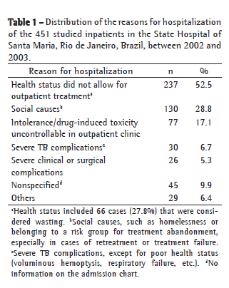 We observed that, in addition to health status not allowing outpatient treatment, some other serious clinical situations, such as severe TB complications and severe clinical and surgical complications combined, were responsible for 65% of the hospitalizations. This, taken together with the fact that approximately 30% of the patients reported dyspnea at admission, underscores the fact that hospitals specializing in TB must be better equipped, and that the clinical staff must be better trained to treat critically ill patients.