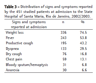 The signs and symptoms mentioned by the patients at admission as the reason for seeking medical treatment were, in order of frequency, weight loss, fever and productive cough (Table 3).