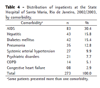 Of the 451 studied patients, 273 (60.5%) presented comorbidities; AIDS, hepatitis (without a distinction between viral and drug-induced hepatitis) and diabetes mellitus being the most frequently observed (Table 4).
