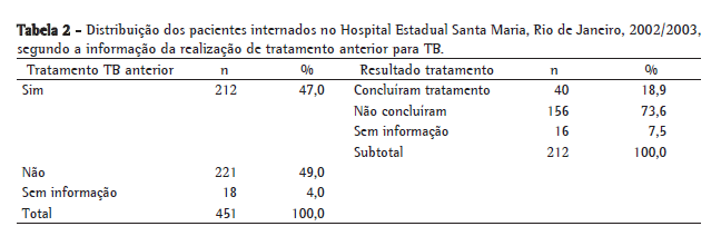 Dos pacientes selecionados, 212 (47%) já haviam realizado tratamento anteriormente, e 73,6% estavam fazendo retratamento após abandono e não-recidiva. (Tabela 2)