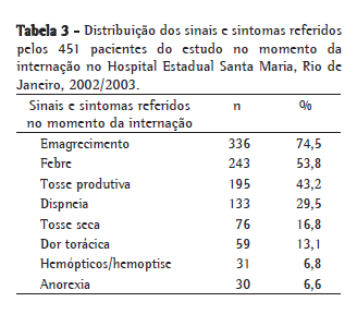 Os sinais e sintomas citados em ordem de frequência pelos pacientes no momento da internação como responsáveis pela procura da assistência médica foram emagrecimento, febre e tosse produtiva (Tabela 3).