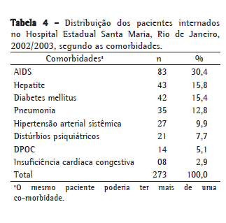 Dos 451 pacientes estudados, 273 (60,5%) apresentavam comorbidades, sendo as mais frequentes AIDS, hepatite (sem especificação se viral ou medicamentosa) e diabetes mellitus (Tabela 4).