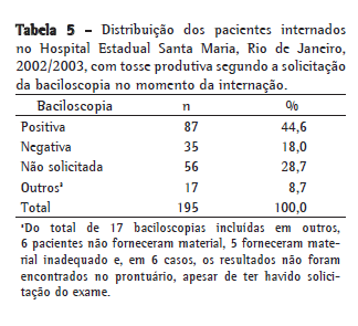 Dos pacientes que apresentavam tosse produtiva no momento da internação (Tabela 5), 44,6% apresentaram baciloscopia positiva; 18%, baciloscopia negativa; e, para 28,7%, não foi solicitada a realização da baciloscopia. Entre os pacientes que tiveram a baciloscopia realizada e o resultado conhecido, 87/122 (71,0%) tiveram resultados positivos.