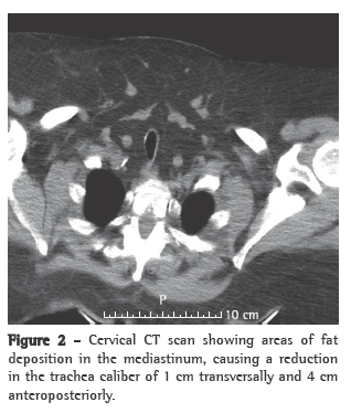 The clinical status of the patient progressively improved, with subsequent reduction in BiPAP pressures and in the use of the ventilator, which was interrupted on post-admission day 6 due to the appearance of facial ulcerations caused by the nasal mask. During the first night without noninvasive ventilation, there were long periods of oxygen desaturation (SpO2 < 88%) and snoring. The patient was then submitted to cervicofacial CT (Figures 1 and 2) and a cardiorespiratory sleep study.