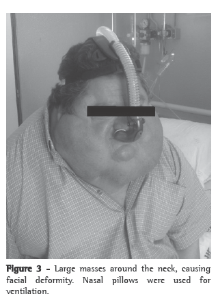 Madelung's disease or multiple symmetric lipomatosis is a rare disease, which is characterized by accumulation of unencapsulated fat, generally located symmetrically around the neck and shoulders. The disease was first documented in 1846 by Brodie, who was followed by Madelung in 1888 and by Launois & Bensaude in 1898.(1,2) It has been referred to by other names, such as lipoma anulare colli, morbus Launois-Bensaude, horse collar, multiple symmetric lipomatosis and benign symmetric lipomatosis. In patients with masses increasing the neck diameter, the disease gradually assumes the appearance of a horse collar.(2) Although the etiology is unknown, it is often seen in patients with a history of chronic alcoholism, and it is usually accompanied by hyperuricemia, dyslipidemia, macrocytic anemia, peripheral neuropathy, glucose intolerance, renal tubular acidosis and alcohol use.(3-5) These fatty masses cause facial disfigurement and are accompanied by digestive and respiratory symptoms. Most patients with Madelung's disease present reduced neck mobility, limited opening of the mouth and compression of vital structures, causing serious problems with respiration and orotracheal intubation.