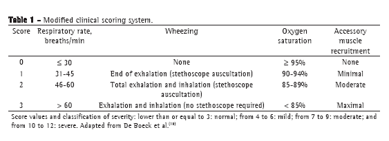 The following clinical markers were used in order to evaluate the severity of the respiratory disease: a clinical scoring system (Table 1), adapted from De Boeck et al.(10); duration of oxygen therapy; duration of mechanical ventilation; and length of hospital stay.