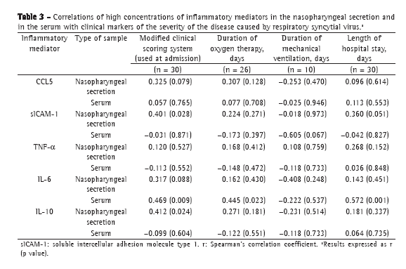 Objetivo: Avaliar se as concentrações dos mediadores inflamatórios (CCL5, soluble intercellular adhesion molecule type 1 [sICAM-1], TNF-α, IL-6 e IL-10) na secreção nasofaríngea e no soro de crianças com infecção do trato respiratório inferior (ITRI) por vírus sincicial respiratório (VSR) apresentam correlação com os marcadores clínicos de gravidade da doença. Métodos: Entre julho de 2004 e dezembro de 2005, 30 crianças com idade inferior a três meses, diagnosticadas com ITRI por VSR e admitidas em uma UTI neonatal foram incluídas neste estudo. Resultados: Houve uma correlação positiva significante entre a gravidade da doença na admissão hospitalar, determinada por um sistema de escore clínico modificado, e as concentrações de sICAM-1 e de IL-10 na secreção nasofaríngea e de IL-6 no soro dos pacientes. Houve também uma correlação positiva significante entre a concentração de IL-6 no soro e o tempo de oxigenoterapia e a duração da internação. Conclusões: As concentrações de sICAM-1 e IL-10 na secreção nasofaríngea e de IL-6 no soro determinadas na admissão poderiam ser usadas como marcadores de gravidade da ITRI por VSR. Os níveis de IL-6 determinados no soro na admissão também poderiam ser usados para predizer o prolongamento da oxigenoterapia e da duração da internação.