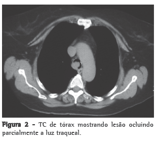 Optou-se por investigar a presença de condições associadas que pudessem estar causando a piora do quadro. A TC de tórax mostrou uma lesão vegetativa da traqueia, localizada a 1,0 cm da carina, com estreitamento endoluminal significativo (Figura 2). A fibrobroncoscopia evidenciou uma lesão endobrônquica violácea, com bordas bem definidas e superfície lisa, implantada na parede lateral direita da traqueia e obstruindo 90% da luz. Não foi realizada biópsia.