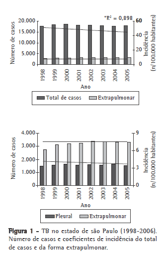 Concluímos que, no estado de São Paulo, a TB extrapulmonar é mais notificada do que nos outros estados. Dentre as formas extrapulmonares, a pleural é a mais comum, estando frequentemente associada à forma pulmonar. Sua incidência, incluindo a pleural, manteve-se estável no período de 8 anos (1998-2005), apesar da tendência de diminuição das formas pulmonares. Para o diagnóstico da TB pleural, a histologia e a bacteriologia não foram os métodos mais informados, o que sugere que esses estejam sendo subutilizados. Finalmente, reafirmamos que a TB deve ser considerada em todos os casos de derrame pleural, independentemente do sexo e da idade.