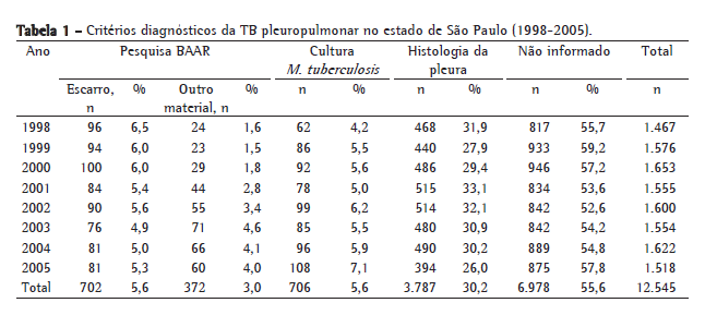 Analisando os casos em que o critério considerado como padrão ouro de diagnóstico (bacteriologia e histologia pleural) foi utilizado (em 44,4% dos casos), aproximadamente 14% dos casos tiveram confirmação bacteriológica-BAAR no escarro (5,6%), BAAR no líquido pleural ou fragmento (3,0%) e cultura positiva para M. tuberculosis (5,6%)-sendo a histologia pleural decisiva para o diagnóstico em apenas 30,2% dos casos notificados.