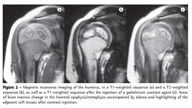 A 21-month-old boy, born in São Paulo, presented with fever and mild functional impairment of the right upper limb. The child had daily episodes of fever (> 38°C), predominantly at night. One week prior, the child had started presenting pain upon palpation and upon movement, as well as limited movement of the right arm. The mother stated that the boy had no history of local trauma. An X-ray of the right upper limb revealed a lytic lesion of the proximal epiphysis/metaphysis, with ill-defined borders, surrounded by a halo of reactive bone sclerosis, periosteal reaction and soft tissue edema (Figure 1). Magnetic resonance imaging revealed areas of abnormal marrow signal and soft tissue edema with highlighting of the infected marrow by the contrast medium-signs consistent with osteomyelitis of the proximal humerus (Figure 2). The patient received cephalosporin for 10 days in an outpatient setting. On day 8 of the antibiotic therapy, the child came to our facility due to fever and persistent pain.