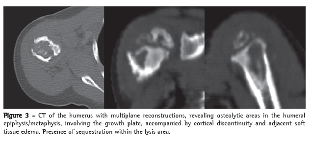 Lytic and sclerotic bone lesions with periosteal reaction characterize the radiographic lesions. In the case described here, the CT findings in the epiphysis, the metaphysis and the diaphysis were consistent with previous descriptions in young patients. Older children usually present only metaphyseal changes.(4)
