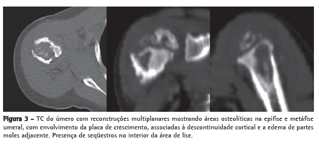 Os exames subsidiários mostraram hemograma com 8.200 leucócitos (9 bastões e 66 neutrófilos); velocidade de hemossedimentação de 32 mm na primeira hora, proteína C reativa < 6,0 mg/L; sedimento urinário normal; radiografia de tórax normal; e PPD positivo reator forte, com 18 mm. A TC de úmero mostrou múltiplas lesões líticas na região proximal do úmero, envolvendo a epífise, a metáfise e a diáfise proximal, com descontinuidade cortical e edema de tecidos moles adjacentes (Figura 3).
