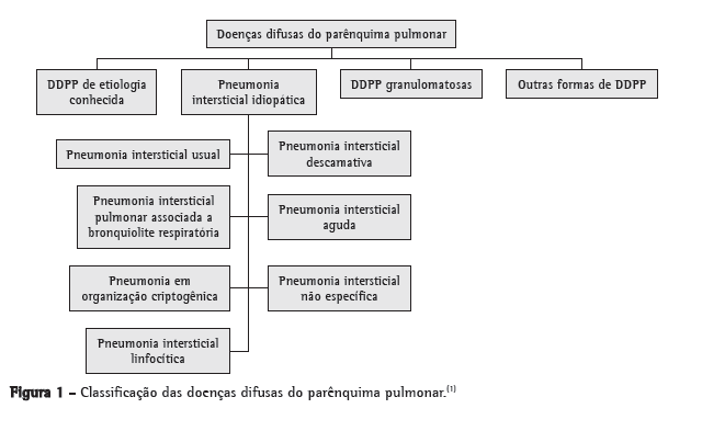 Segundo a American Thoracic Society/European Respiratory Society,(1) as DDPP podem ser divididas em quatro categorias: DDPP de etiologia conhecida; DDPP granulomatosas; pneumonia intersticial idiopática; e outras formas de DDPP (Figura 1).