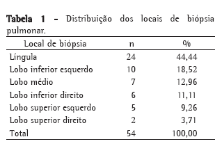 Foram enviados 54 fragmentos de biópsia pulmonar para a análise anatomopatológica, sendo 39 (72,22%) do pulmão esquerdo e 15 (27,28%) do pulmão direito. A Tabela 1 mostra a distribuição dos locais de biópsia.