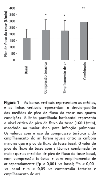 DiscussãoNeste estudo, descrevemos que, em adolescentes portadores de DMD e distúrbio ventilatório restritivo grave, a assistência à tosse através do empilhamento de ar e/ou da compressão torácica aumentou a eficiência da tosse. É na segunda década de vida, quando há evolução para cifoescoliose e/ou restrição pulmonar, que esses adolescentes apresentam episódios de insuficiência respiratória potencializadas pelo acúmulo de secreção traqueobrônquica. Durante os episódios de infecção pulmonar, porém, é fundamental uma estratégia terapêutica adequada que auxilie os músculos expiratórios. O tratamento inicial da insuficiência respiratória aguda em indivíduos normais inclui a suplementação de oxigênio; porém, em pacientes com doença neuromuscular, há maior risco de retenção de gás carbônico e não há benefício do uso da oxigenoterapia.(11) Ainda, a oxigenoterapia não permite que a saturação da oxi-hemoglobina seja um alarme do acúmulo de secreção, momento em que os familiares e os profissionais de saúde devem realizar as medidas de limpeza da secreção pulmonar. Como observamos neste estudo, o uso da técnica combinada teve maior eficácia do que cada técnica isoladamente. Para todos os pacientes, foi possível realizar um incremento do PFT, sendo que, para 7 dos 8 pacientes que apresentavam PFT < 160 L/min, foi possível superar esses níveis. Esse é um achado importante, pois esse é o limiar conhecido como o maior fator de risco para infecções pulmonares.(3) Por isso, é importante orientar essas famílias quanto às técnicas de compressão torácica e de empilhamento de ar, além da aquisição de uma bolsa de ventilação.