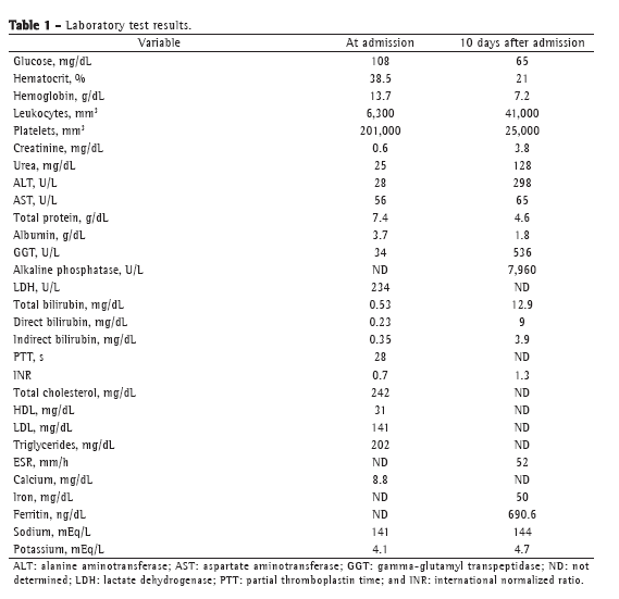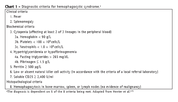 Diagnostic criteria for HPS, developed by the Histiocyte Society, are described in Chart 1.(17) Hemophagocytosis can be established not only in bone marrow but also in lymphoid tissues such as the liver, spleen, and lymph nodes. Histological identification of hemophagocytosis is considered the gold standard for the diagnosis of HPS; however, in up to 20% of patients, histological examination of the first bone marrow biopsy specimen does not reveal hemophagocytosis. Because hemophagocytosis can occur at different sites during the course of the disease, repeated biopsies are sometimes required for the diagnosis of HPS.(7) Okamoto et al.(6) investigated 28 patients with secondary HPS and without a history of hyperlipidemia. Their results suggest that the triglyceride level is useful for diagnosing HPS and evaluating treatment response.(6) Ferritin levels constitute an important diagnostic parameter. However, slightly elevated ferritin levels can be found in various inflammatory diseases, being therefore nonspecific. Nevertheless, ferritin levels greater than 10,000 µg/L are found only in patients with HPS, Still's disease, or malignant histiocytosis, as well as in those who have received multiple blood transfusions.(7) According to Knovich et al.,(18) "in a prospective study of adult HPS patients, the percentage of glycosylated ferritin was lower in patients with HPS, suggesting that low glycosylated ferritin could be a marker of severe HPS. The elevated ferritin is hypothesized to be due to passive release from cell damage in the liver and spleen, increased secretion by macrophages or hepatocytes, or decreased clearance due to lower glycosylation or down regulation of ferritin receptors." Without intensive treatment, severe HPS is fatal. In adult patients, early intensive treatment can increase the chances of survival.(7)