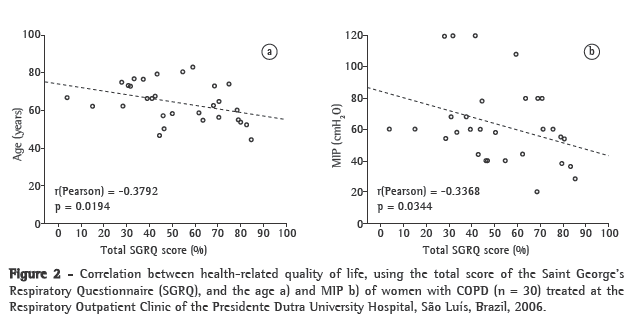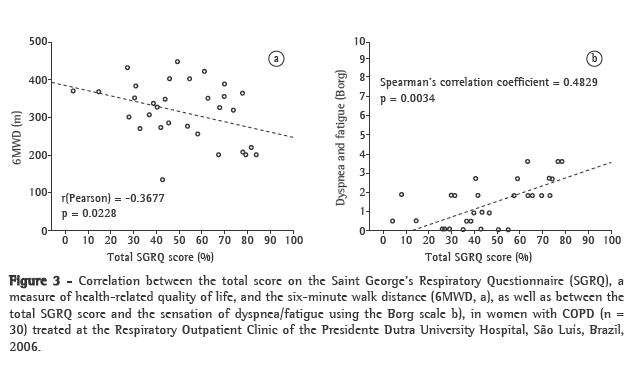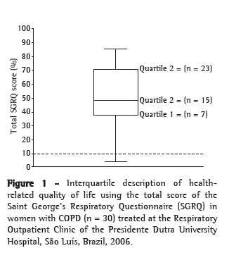 Objective: To correlate health-related quality of life (HRQL) of women with COPD with clinical parameters and with the six-minute walk distance (6MWD; six-minute walk test). Methods: Cross-sectional study involving 30 female patients diagnosed with mild or moderate COPD treated at the Respiratory Outpatient Clinic of the Presidente Dutra University Hospital. Patients completed the Saint George's Respiratory Questionnaire (SGRQ) and were evaluated in terms of respiratory pressures, spirometry parameters and 6MWD. Descriptive statistical analysis was carried out, as were Student's t-tests for dependent variables, together with Pearson's and Spearman's correlation coefficients for numerical and ordinal variables, respectively. Results: According to the SGRQ total scores, HRQL was impaired, to some extent, in most of the participants. Most SGRQ total scores were between the second and the third quartiles, reflecting poor HRQL. The participants also presented poor functional capacity. Mean 6MWD (317.7 m), inspiratory muscle strength (−53.48 cmH2O) and expiratory muscle strength (69.5 cmH2O) were all below reference values. We found that HRQL was not correlated with body mass index or pulmonary function. However, HRQL presented a negative linear correlation with age, MIP and 6MWD, as well as a positive correlation with the sensation of dyspnea and fatigue. Conclusions: In this study, HRQL, determined using the SGRQ, was severely impaired in COPD patients, who presented severe limitations in functional capacity, breath control and personal life.