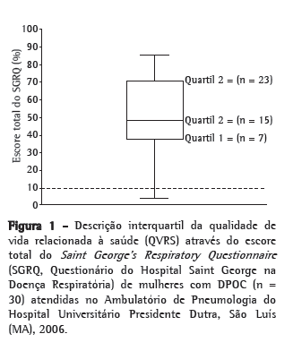 A grande maioria das mulheres entrevistadas (86,7%) apresentou comprometimento da QVRS, em graus variados, de acordo com o escore total do SGRQ (%). Valores acima de 10% indicam alguma alteração da QV. Quanto maior o somatório do SGRQ, pior é a QVRS. Na Figura 1, observa-se que 7 mulheres encontram-se no primeiro quartil, com escore do SGRQ de 36,37%, sendo que deste total apenas 4 apresentaram percentual igual ou inferior a 10%. No segundo quartil foram 15 mulheres, com escore de 48,20%, e no terceiro quartil foram 23 mulheres, com escore de 70,46%.