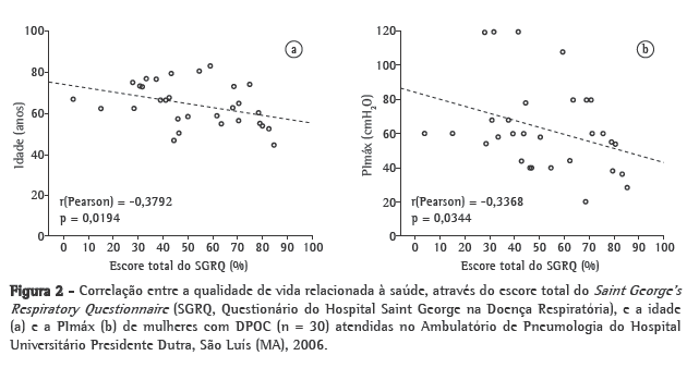 No entanto, quanto pior foi a QVRS das pacientes avaliadas, pior foi o resultado da capacidade funcional, medida pelo TC6, e pior a força inspiratória (PImáx), ou seja, quanto menor à distância percorrida no TC6, maior o somatório das respostas do questionário do SGRQ e, portanto, pior a QVRS. Em um estudo similar,(25) houve correlação negativa do TC6 com os domínios atividades e impacto, apontada como um reflexo de limitada atividade funcional e física dos pacientes pesquisados. Em outro estudo,(23) os autores também demonstraram correlações negativas entre o teste de caminhada de 12 minutos e os domínios atividades e impacto, confirmadas por regressão múltipla. A baixa capacidade ao exercício e a dispneia constituem fatores etiológicos, diferentes dos tradicionais, que resultam em comprometimento da QVRS de pacientes com DPOC.(23)