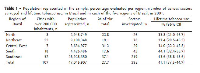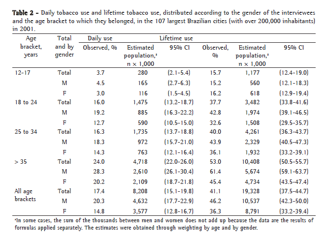 The present study was carried out 12 years after the Brazilian National Survey on Health and Nutrition (1989) and aided in revealing the behavior of the Brazilian population regarding tobacco consumption. According to the data obtained for 2001, 17.4% of the Brazilian population residing in the 107 largest cities of the country were current smokers (20.3% of the men and 14.8% of the women); the prevalence increased to 24.0% when only those ≥ 35 years or age were considered (28.3% of the men and 20.2% of the women). Although the study did not include all of the cities in Brazil, which would have been practically impossible, it has the merit of having evaluated all Brazilian cities with over 200,000 inhabitants, in all regions of the country and in a randomized manner, which should reflect the general attitude of the Brazilian population toward smoking.