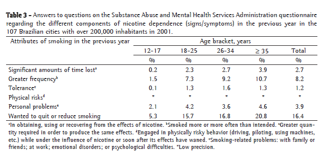 Approximately 30.0% of Brazilian smokers smoke 20 or more cigarettes per day, which suggests a high level of dependence.(20) This is in accordance with the results of a recently published study, in which the mean Fagerström test score(21) was high (6.2 ± 2.0) among 203 smokers who sought a smoking cessation program.(22) This finding shows the importance of determining not only the number of smokers but also the prevalence of nicotine dependence in the population. This is justified by the fact that the treatment of nicotine-dependent smokers should have a broader approach and include pharmacological intervention.(23) In this context, the present study is, to date, the only study that has provided data regarding the prevalence of nicotine dependence in a large population sample, as well as the prevalence of the principal signs and symptoms of nicotine dependence. Our survey showed that, according the NHSDA criteria, 9.0% of the sample (10.1% of the men and 7.9% of the women), and probably of the Brazilian population, are nicotine-dependent. The questions receiving the greatest numbers of affirmative responses were those regarding excessive consumption and the desire to reduce or quit smoking. The highest prevalence of nicotine dependence was observed among individuals ≥ 35 years of age (11.3%), which is explained by the longer smoking history, which increases smoking exposure and, consequently, the probability of becoming dependent. The lowest prevalence of nicotine dependence was found among the youngest individuals (12-17 age bracket), many of whom were probably still in the experimentation phase. It should be borne in mind that the NHSDA criteria allow us to define whether there is psychoactive drug dependence (in the case of the present study, nicotine was the drug of interest) but do not allow us to evaluate the intensity of dependence, specific complementary instruments such as the Fagerström Test for Nicotine Dependence being required for that purpose.(21,23)