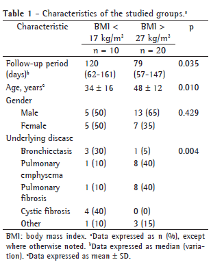 A significant difference was found in the relationship between the underlying disease and the nutritional status, showing that bronchiectasis and cystic fibrosis are more closely related to malnutrition, and those with pulmonary fibrosis and pulmonary emphysema presented excess weight. The fact that patients with cystic fibrosis are malnourished is known.(3,11) However, data from the literature also indicate the malnutrition of patients with pulmonary emphysema,(12) which is not consistent with our results.