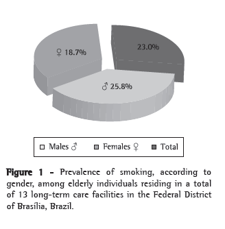 DiscussionIn the present study, the prevalence of smoking among institutionalized elderly individuals aged 60 years or older was 23% (25.8% among males and 18.7% among females). In the literature, we found only two studies investigating the prevalence of smoking among elderly individuals in assisted-living facilities. One of the studies, conducted in 2004, reported the prevalence of smoking to be 14%,(18) compared with 11% reported in the other study, conducted in 2008.(19) The latter investigated only individuals aged 65 years or older. The difference between the results of those studies is probably due to the differences in the distribution of the genders in the populations studied. In general, the prevalence of smoking is lower in study samples in which the female gender predominates. In the two studies cited above, females accounted for 64% and for 75% of the sample, respectively.(18,19) The association between the predominance of the female gender and a lower prevalence of smoking is in accordance with the sociocultural profile of the generation in question, according to which males smoke more than do females, regardless of age.